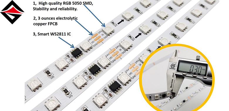De stromende lichtstrook gebruikt meestal drie primaire kleuren LED -lampkralen, rood, groen en blauw, die een verscheidenheid aan kleuren kunnen mengen. High-end modellen ondersteunen de onafhankelijke adressering van de volledige kleur, elke LED kan de RGB-waarde afzonderlijk instellen, met ongeveer 16 miljoen kleuren.